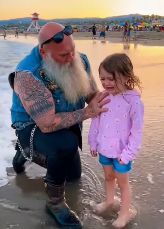 One rider shut off his engine and stepped down. He was tall, broad, the kind of man strangers often judged by his appearance alone. Tattoos traced his arms, boots heavy in the sand. Yet when he knelt to the girl’s level, his voice softened instantly.