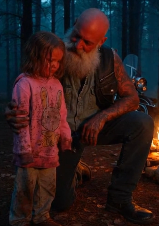 Flashing lights cut through the trees before they reached the bikes. Relief has a color, and that night it was red and blue. Her parents ran forward, voices breaking, tears spilling freely as they dropped to their knees. The biker gently set her down, and she disappeared into their arms like she’d never let go again.