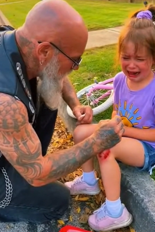 “She took a spill,” the biker replied calmly, never looking away from the girl. “She’s shaken, but she’ll be okay.”