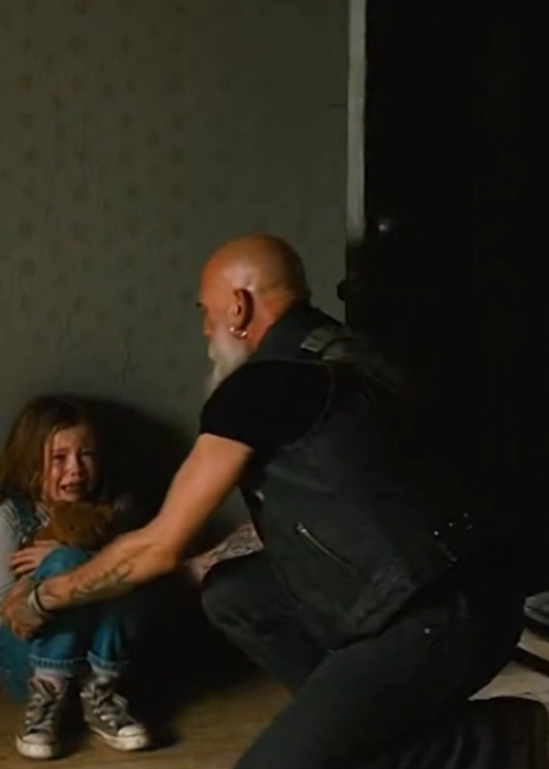 The girl looked up, eyes wide, tears streaking down her face. Her body shook so hard she could barely speak. Fear had locked her into place. The biker reached out carefully and lifted her into his arms, holding her close enough to feel steady support without squeezing too tight.