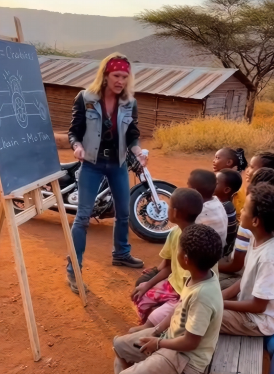 Every afternoon, right as the sun dipped behind the dusty hills, a motorcycle appeared at the edge of their forgotten village. It didn’t roar for attention. It didn’t shine with polish. It simply arrived, carrying a young woman in a worn leather jacket, helmet tucked under her arm, boots coated with the same dust the village had always known.