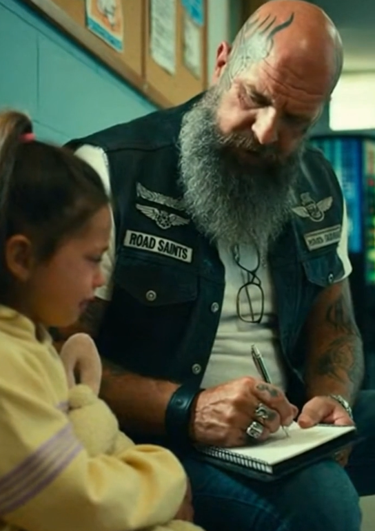 A small group of riders parked along the curb, chrome catching the sunlight. At the center walked a tall man in a weathered leather vest. Patches were stitched carefully across his chest. His beard carried streaks of gray, and his posture radiated calm strength.