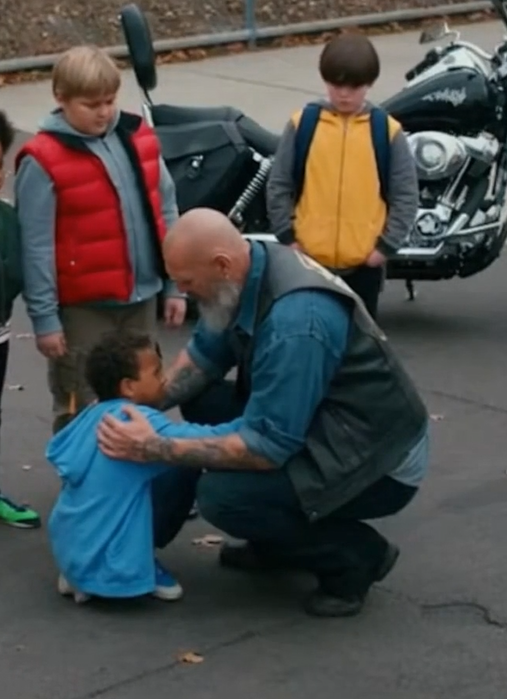The biker continued, “If someone puts hands on you, you tell an adult. You come stand near people. You don’t carry it alone. That’s not weakness. That’s smart.”