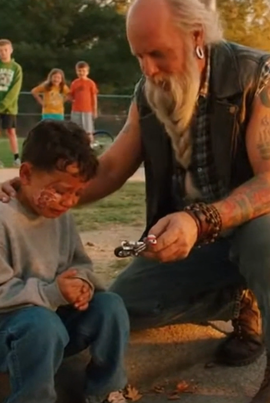 He simply walked forward and placed himself between the boy and the others. His shadow fell wide across the pavement. Leather vest. Heavy boots. Calm eyes that had seen worse than schoolyard cruelty.