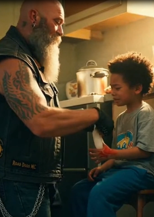 The biker ran cool water gently over the burn. He didn’t rush. He didn’t press. He let the water flow just enough to help without making the injury worse. Another biker stepped in, pulling a clean cloth from his saddlebag and wrapping it loosely around the boy’s hand to protect it.