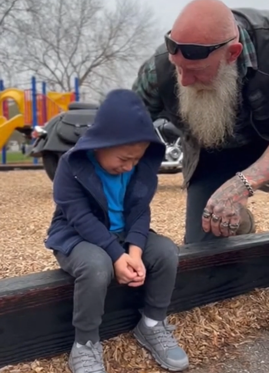 The biker followed his gaze. He didn’t rush to speak. He placed a firm hand on Caleb’s shoulder.