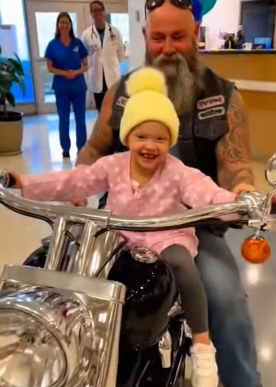With care and patience, they lifted her onto a large motorcycle, settling her gently in front so she could see the road ahead. A tiny helmet rested slightly crooked on her head, making her giggle even more. Her small hands wrapped around the handlebars like she had been waiting her whole life for that moment.