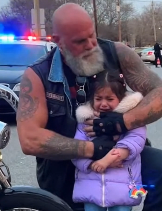 Without saying a word, the biker removed his helmet and gently covered the little girl’s ears with his hands. Not roughly. Not in a hurry. Just firm enough to block the noise, gentle enough to feel safe.