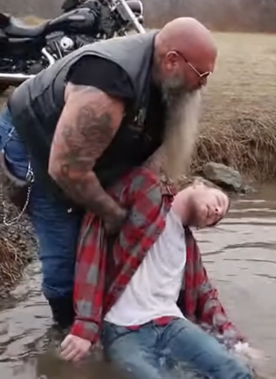 The biker reached the water, bracing himself against the pull of the river. The cold bit through his clothes instantly, but he ignored it. He grabbed the man by the collar, pulling him close, steadying him.