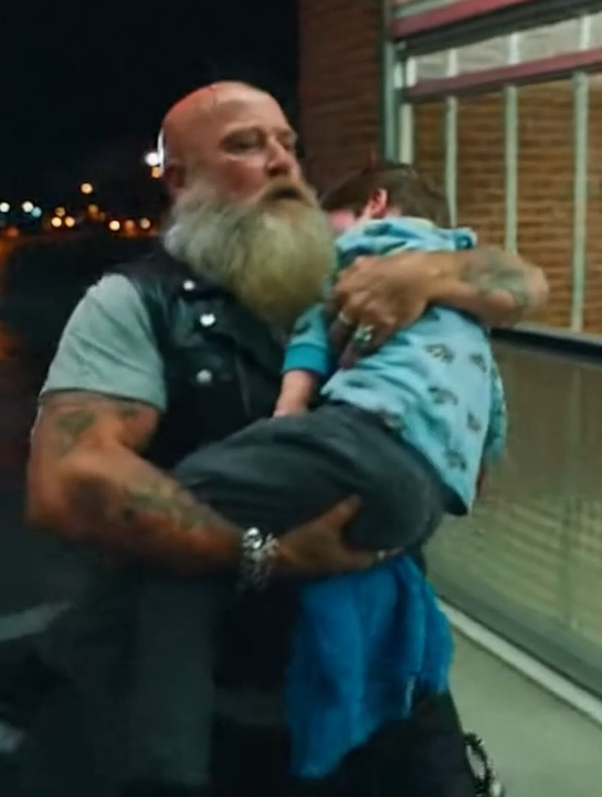 At the clinic, the biker cut the engine before the bike fully stopped. He was already off, lifting the boy and moving through the doors with the kind of focus that clears a path without words.