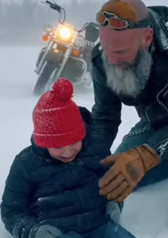 He stopped, jumped off the bike, and pushed through the snow, boots crunching against ice. Without a second thought, he dropped to his knees and wrapped the child in his arms—strong, steady, and unshaking.