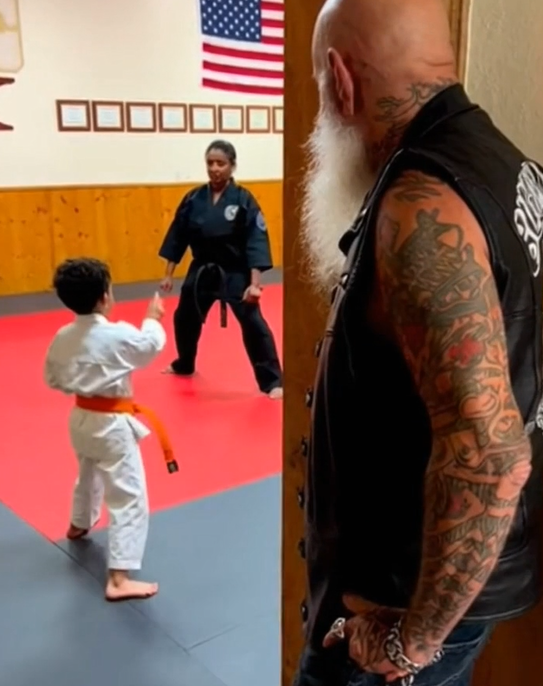 When class ended, the boy’s face was flushed—not from fear, but from effort. He stood a little straighter. His shoulders weren’t pulled inward anymore. He met the biker’s eyes without looking away.