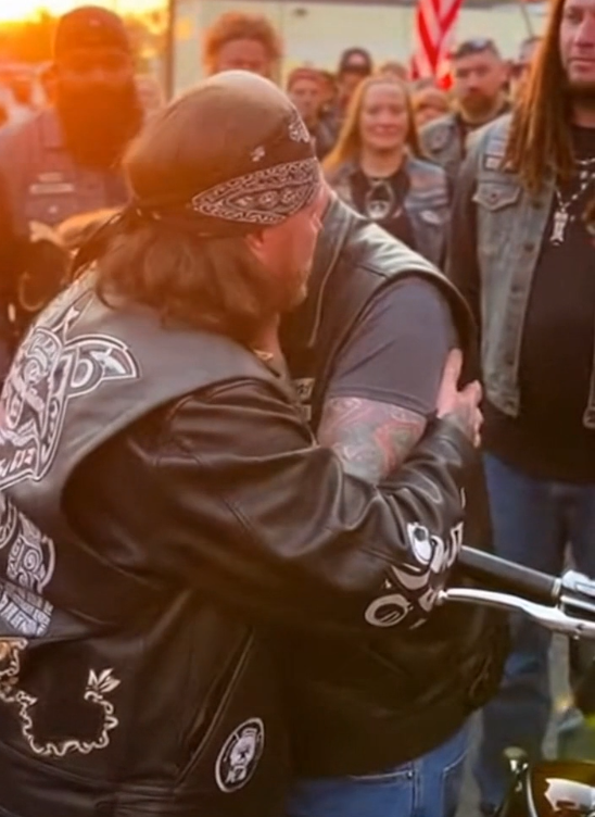 The biker pulled him in, arms tight around his shoulders. And he broke. Not quietly. Not politely. He cried hard, shaking, like someone who had been holding his breath for far too long.