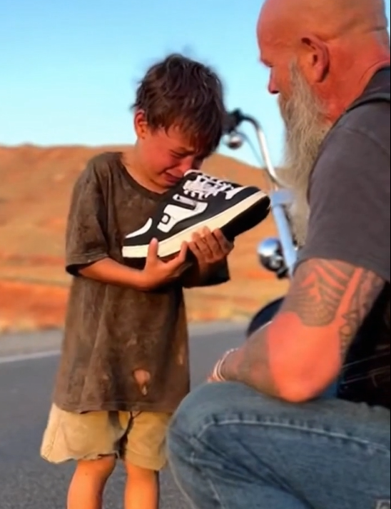 The biker glanced down at the boy’s feet. Red from heat. Dusty. Small cuts along the heels that told their own story. He felt that familiar tightness in his chest—the feeling that shows up when something simple has gone wrong for far too long.