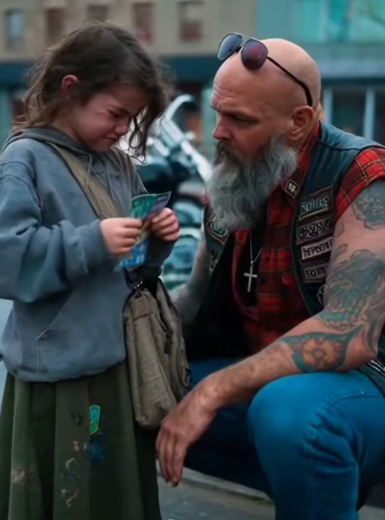 It wasn’t a polite hug. It was the kind that comes from holding everything inside for too long. Lily cried hard, her small frame shaking. The biker wrapped his arms around her carefully, steady and patient, shielding her from the noise of the street as if the world could wait.