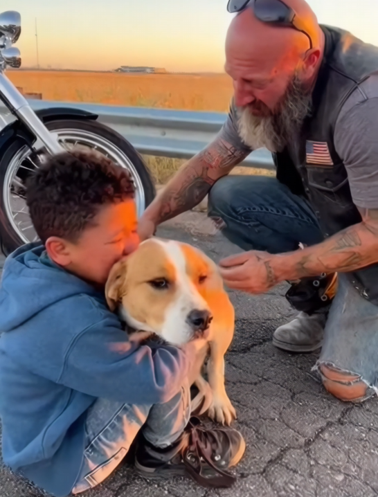 The ride was slow and careful. The biker didn’t rev the engine or weave through traffic. The dog sat between them, the boy’s arms wrapped tight around him like letting go wasn’t an option.