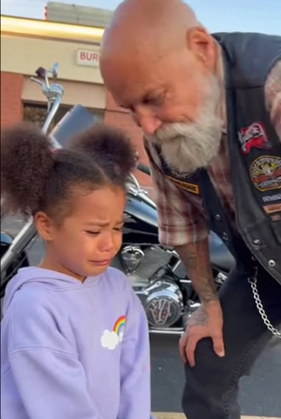 The biker didn’t rush in. He didn’t tower over her. He stood nearby and asked gently if she was okay. The girl shrugged, eyes still down, and finally explained.