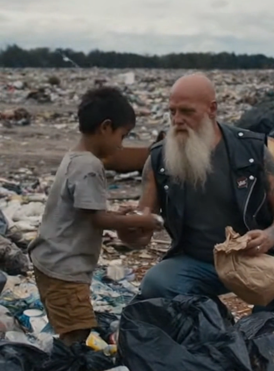 On the edge of town, among discarded things and forgotten spaces, an American biker made a simple but powerful choice. He stopped. He reached out. He walked a child away from a place that was never meant to hold him.