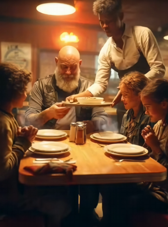 He ordered warm, simple meals. Nothing fancy. Food that filled you up and made you feel safe. While they waited, he joked with them. Asked about school. About music they liked. About silly things that didn’t matter but somehow mattered a lot in that moment.