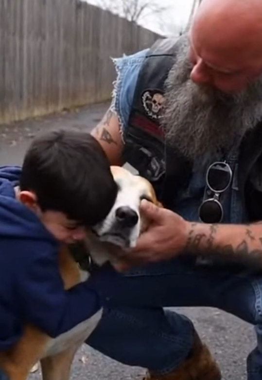 On the curb sat a small boy, knees pulled tight to his chest. In his arms was a dog, thin and exhausted, clinging just as tightly in return. The scene felt fragile, like a photograph that could tear if touched too roughly. The biker eased off the throttle and pulled over, his instincts telling him this wasn’t something to pass by.