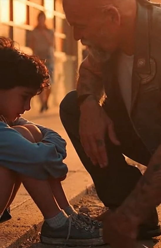 The biker picked up the loose lace, brushing dust from it like it mattered. His hands moved slowly and carefully, tying the knot tighter than it had been in a long time. Not rushed. Not careless.