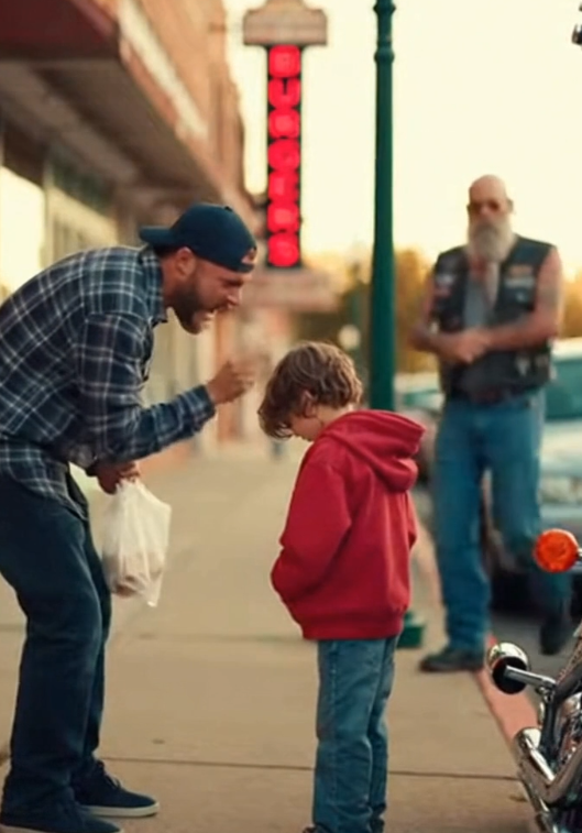 The biker lowered himself slightly, bringing his presence closer to the boy’s level.
