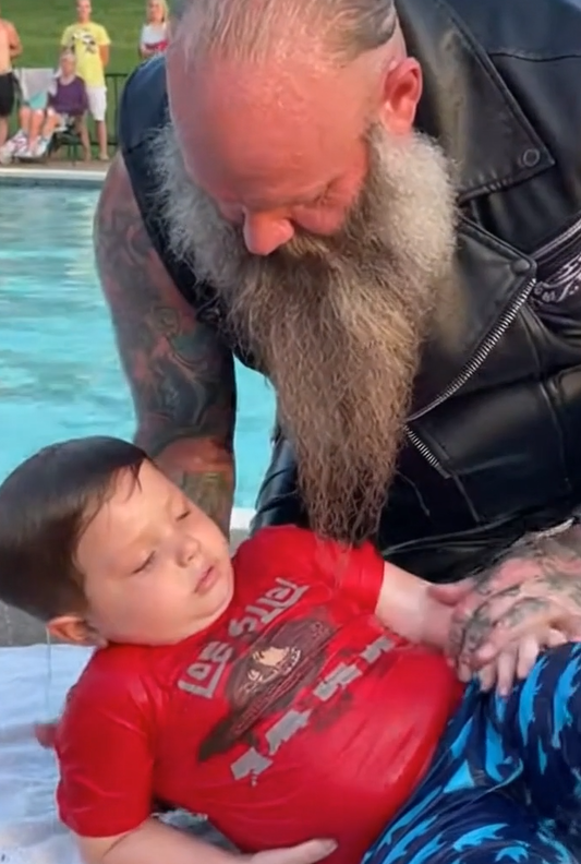 They burst through the water in one motion. The biker lifted the boy high enough to breathe, coughing and sputtering, and pushed him toward the pool’s edge. Hands reached out instantly. Parents rushed forward. Someone shouted for the lifeguard.