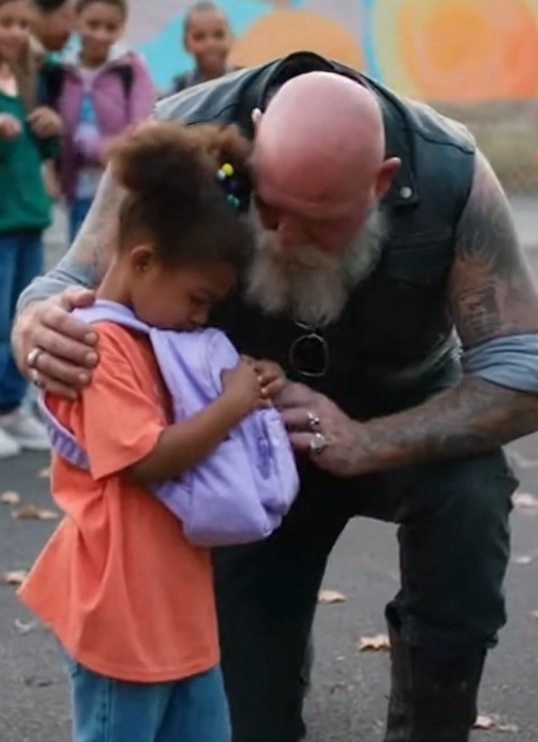 The biker saw it in the way the girl moved. She walked a little faster when others were nearby. She kept her shoulders tight, as if trying to make herself smaller. She hugged that worn backpack like it was something she needed to apologize for.