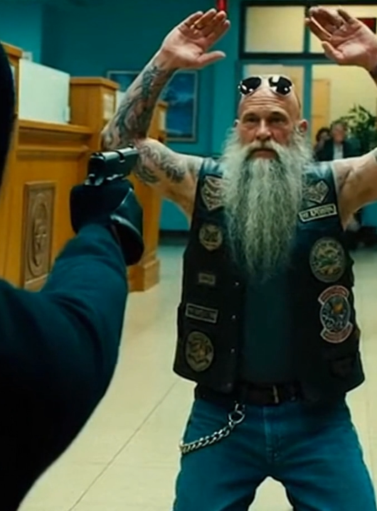 He wore a weathered leather vest over a dark shirt, and his gray beard rested against the collar as he waited quietly. His motorcycle helmet sat tucked under one arm, and his heavy boots tapped lightly against the floor.