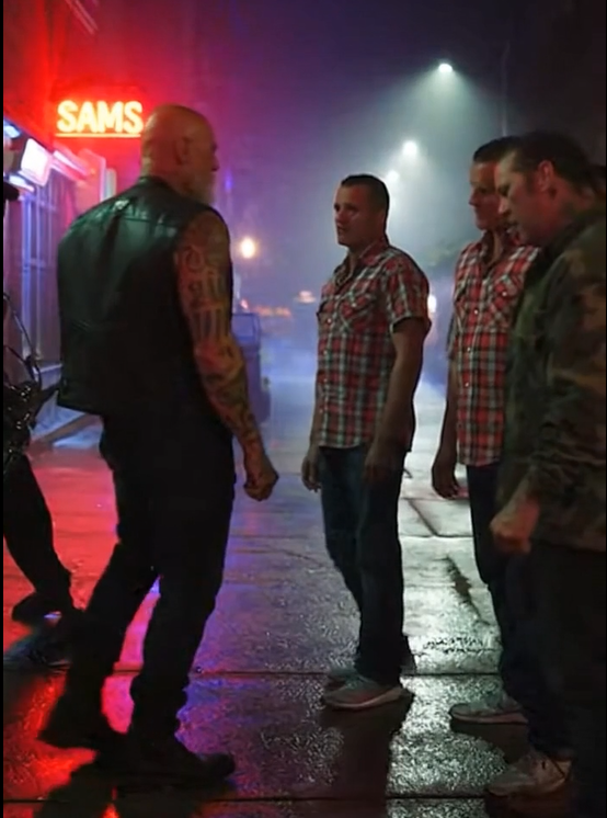 He killed the engine and stepped off his bike. No rush. No drama. He walked straight toward the girl and positioned himself in front of her, shoulders squared, boots planted like roots in concrete.