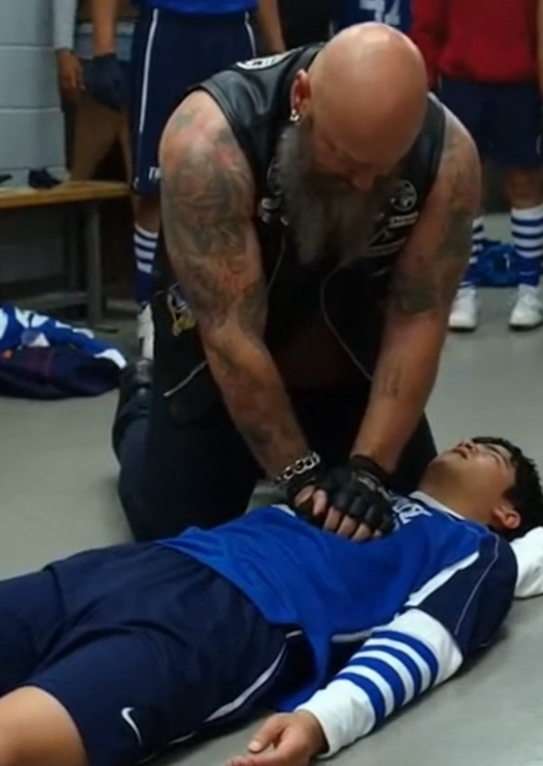 The biker didn’t rush him. He didn’t panic. He stayed present, talking softly, anchoring the boy to the moment like a lifeline.