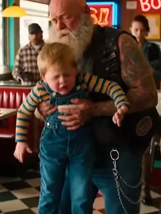 The biker didn’t wait to see if someone else would move. He didn’t ask questions. He stood up and crossed the room with calm urgency, placing a steady hand on the boy’s back as he dropped to one knee so they were eye level.