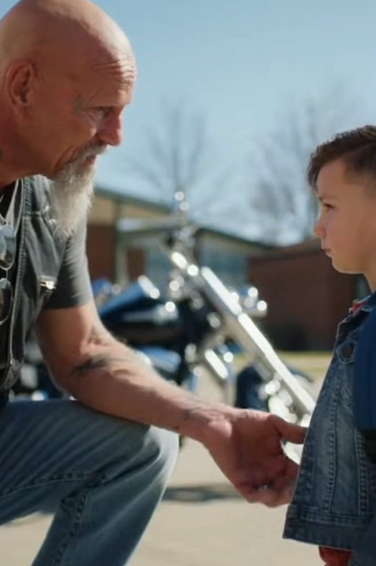 Leather jacket. Helmet tucked under his arm. The kind of calm presence that comes from living a lot of life and not needing to prove anything. He stopped at the edge of the fence and watched for a moment. He saw the boy step back. He heard the comments. He noticed the silence that followed.