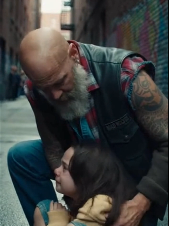 The biker didn’t threaten. He didn’t posture. He didn’t step closer than he needed to. He simply stood there, broad and still, taking up the space that fear had claimed.