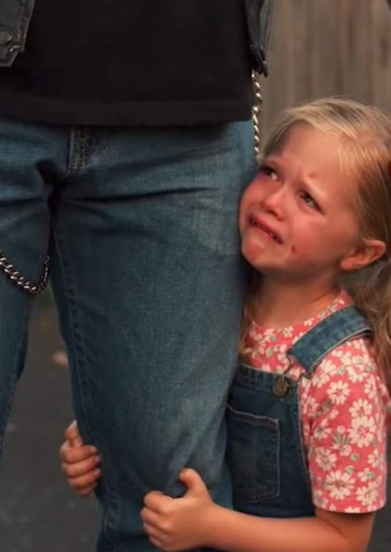 From down the street came the deep, low rumble of a motorcycle. A biker, tall and broad-shouldered, with a leather jacket catching the sun and a chain glinting on his side, slowed as he noticed the commotion. His eyes locked onto the girl, and instinct surged through him like a tidal wave. He couldn’t just ride past.