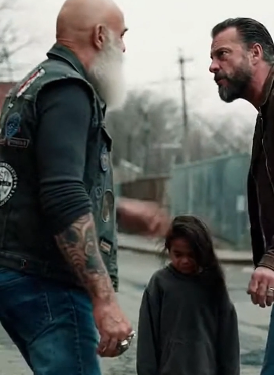 A biker moved between them, fast but controlled. Leather vest. Heavy boots planted firmly on the ground. A presence that didn’t need permission or explanation. He placed himself squarely in the middle, separating the girl from the person who had hurt her with one firm, deliberate motion.