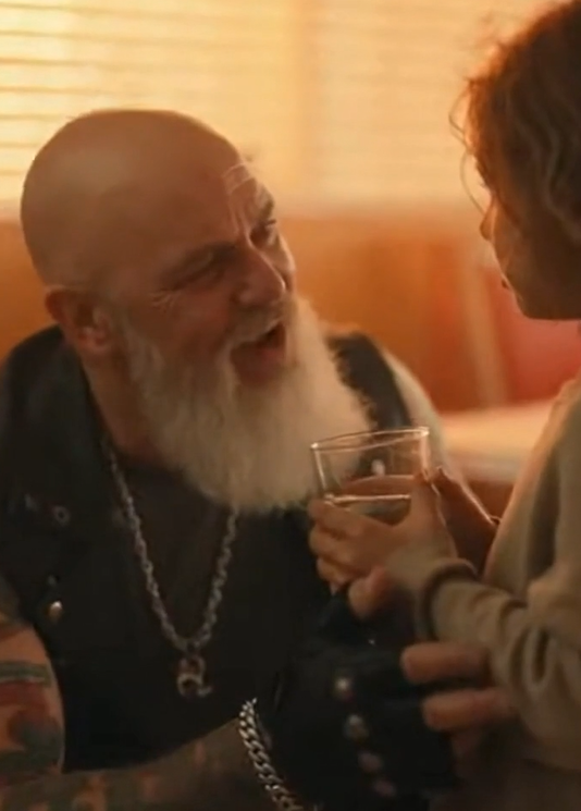 He sat at the table near the spill, leather jacket draped over the back of his chair, dusty boots planted firmly on the floor. A motorcycle helmet rested beside him. A biker—the kind people noticed before they knew why.