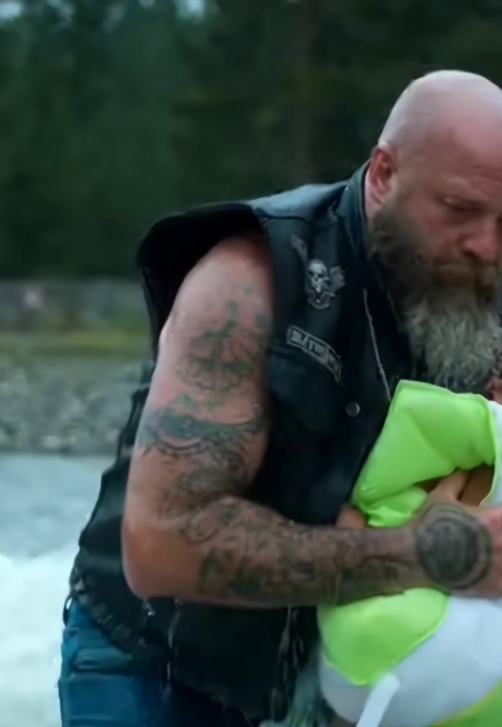 A sudden storm turned a harmless stream into a dangerous current. A six-year-old girl slipped and was pulled under. While others froze, a biker ran, jumped, and turned himself into a shield between a child and the force of the water.