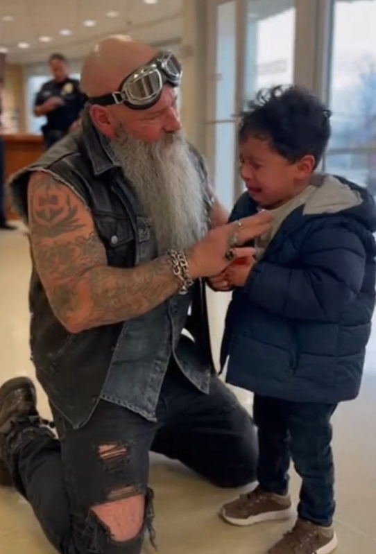 When the biker knelt down to the boy’s level, he knew how he looked—leather jacket, beard, road-worn boots. Not exactly storybook friendly. The boy flinched, unsure whether to trust him. That hesitation mattered.