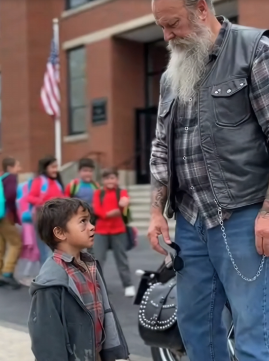 The low engine noise made a few heads turn. The boy glanced up, then quickly looked back down, like attention was something to avoid. The biker took off his helmet and noticed him right away.
