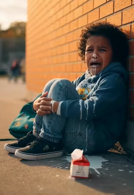 A crushed milk carton hung loosely in his hand. White liquid stained his shirt. His face was wet—milk mixed with tears he clearly didn’t want anyone to see.