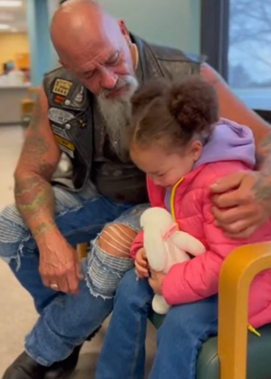 In a place filled with urgency and noise, a biker chose stillness. He didn’t rush to fix what wasn’t broken. He didn’t ignore what was obvious. He simply sat beside a frightened child and gave her time, attention, and a story to hold onto.