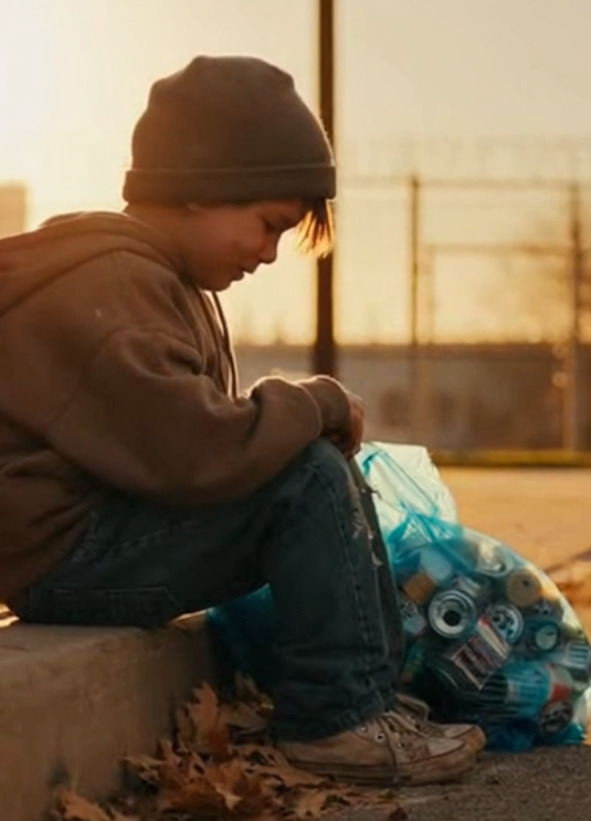 A six-year-old boy, sitting alone on a sidewalk, collecting trash—not for survival, but to make someone else smile.