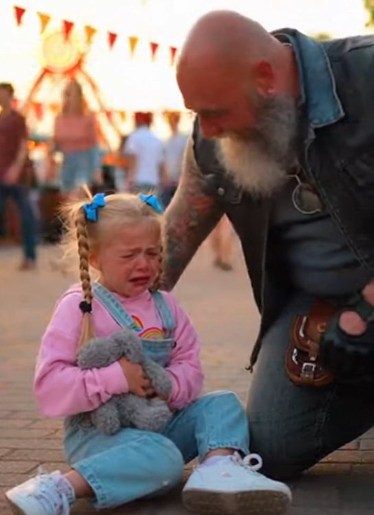 In a place filled with sound, fear has its own volume. A biker weaving through the crowd heard it before he saw her. He stopped immediately. Helmet hanging loosely from his hand. Leather vest catching the glow of the festival lights. He scanned the space and spotted her right away. Too small. Too still. Completely overwhelmed. Experience teaches you to notice that kind of stillness in chaos.