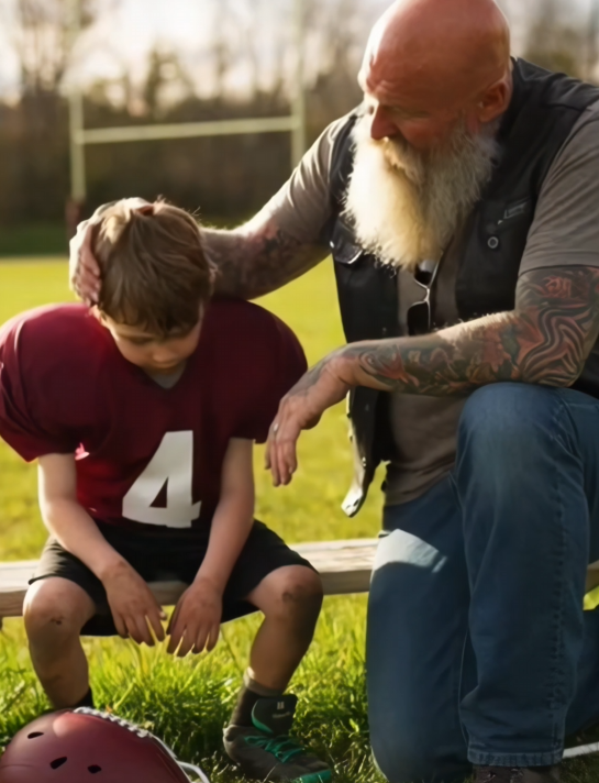 A motorcycle rumbled to a stop near the parking lot. The sound cut through the quiet like a low drumbeat, steady and calm. The boy heard it, but he didn’t look up. He stayed still, jaw tight, blinking back tears he didn’t want anyone to notice.