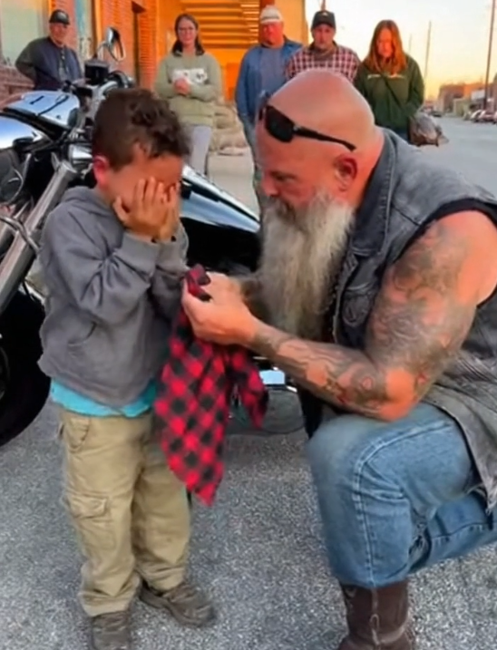 The shop owner hesitated, then disappeared into the back room. Minutes passed. The boy stood completely still, like movement might invite punishment. The biker stayed beside him, close enough to matter, quiet enough not to overwhelm.