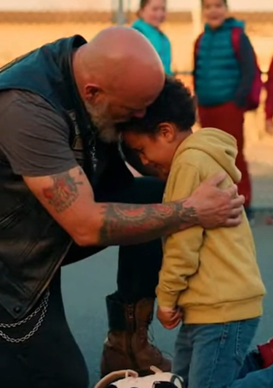Without hesitation, the biker opened his arms and pulled the boy into a hug.