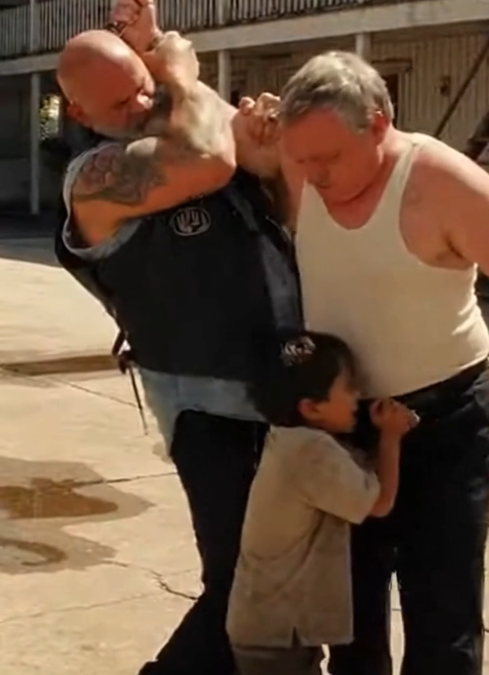 One biker pulled off his helmet and took a single step forward. He didn’t rush. He didn’t posture. He didn’t need to. His presence alone changed the balance of the moment.