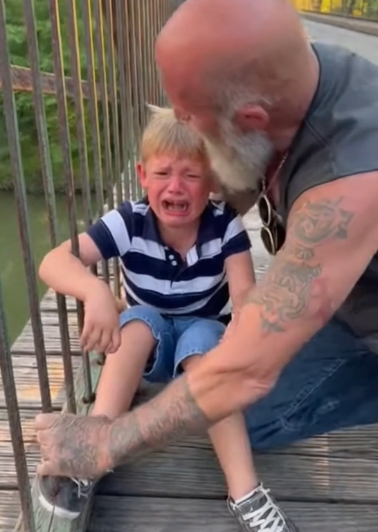 The foot was wedged tight. The metal railing left no room for forceful extraction without risk. The biker crouched beside the boy and spoke reassuringly.