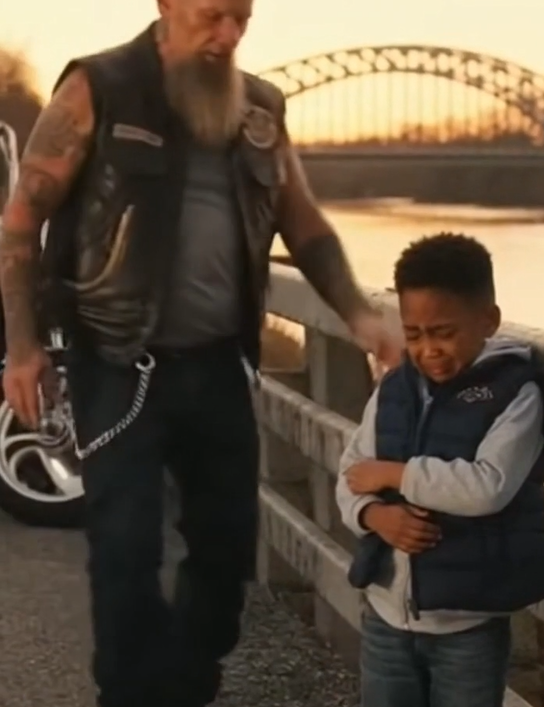 They sat together on the bridge, three bikers and one boy, watching the river move steadily below. Time slowed. Ethan’s breathing evened out. He slipped into Erin’s jacket, far too big for him, and for the first time, a small smile appeared.
